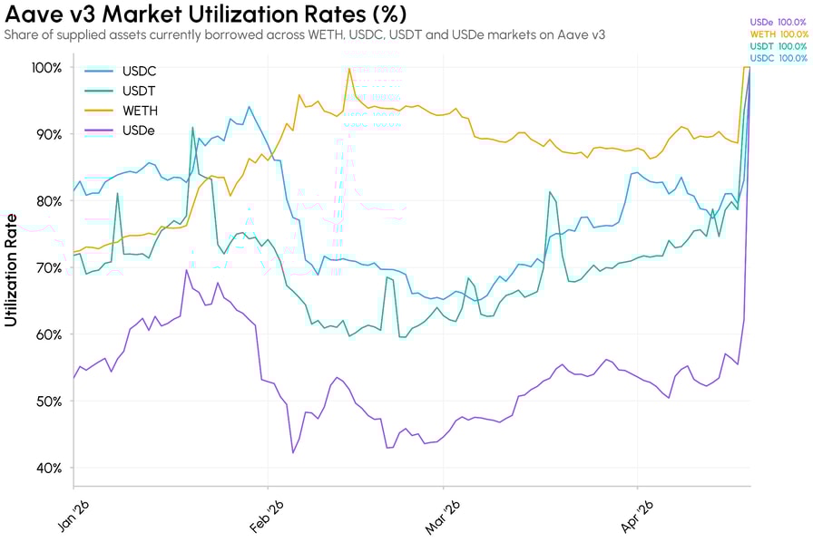 Aave v3 Market Utilization Rate percentage across USDC, USDT, WETH, USDe. Source: Talos