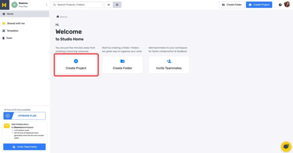 Start by navigating to the Studio Home Screen, then click the Create Project button.